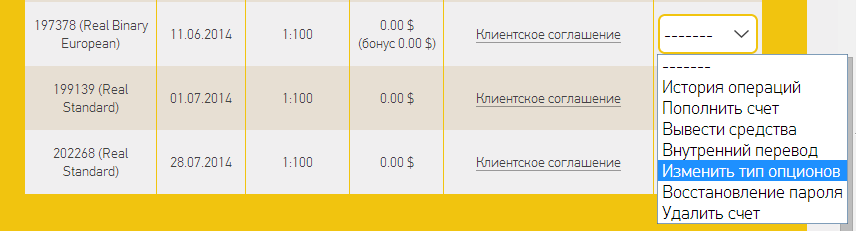 мои счета", напротив нужного счета в меню «действия», нужно выбрать «Изменить тип опционов»