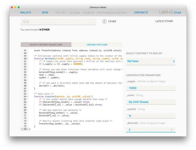 В нашем первом контракте, мы создадим жетоны (token). Жетоны в экосистеме Эфириума это ваша личная расчетная единица, которая может выполнять функции: монет, баллов голосования, золотых сертификатов, долговых обязательств, игровых предметов и т.п. Жетоны всех типов обладают похожими свойствами и имеют одинаковые базовые функции — их можно передавать. Это значит, что жетон, который вы создадите автоматически будет совместим с Ethereum Wallet или другими подобными программами.